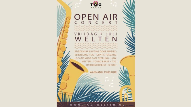 Vrijdag 7 juli staat het jaarlijkse ‘Open Air Concert’ op de hoek bij Café Teerling in Welten plaats, vanaf 19.00 uur. Zowel de Young Brass-groep, het Jeugdorkest en het harmonieorkest zullen dit concert opluisteren.