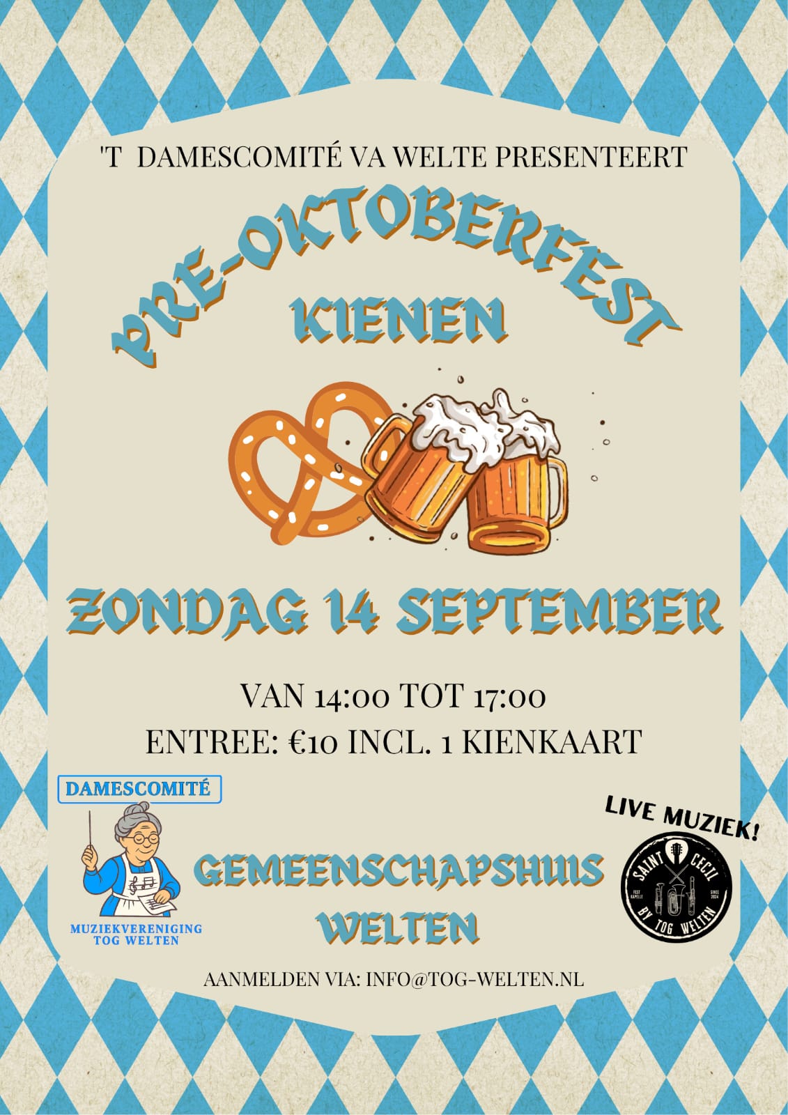 Nou … Wij! Om u alvast in de stemming te brengen organiseert ons Damescomité een Pre-Oktoberfeest Kienmiddag in Gemeenschapshuis Welten! Van 14.00 tot 17.00 uur. Entree: €10 (incl. een kienkaart).